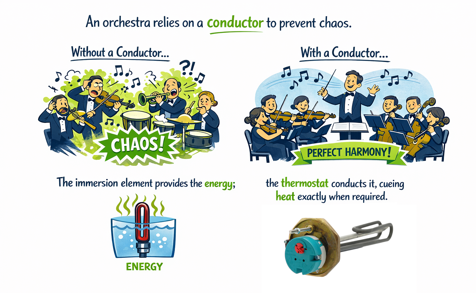 "An orchestra relies on a conductor to prevent chaos. The immersion element provides the energy; the thermostat conducts it, cueing heat exactly when required."